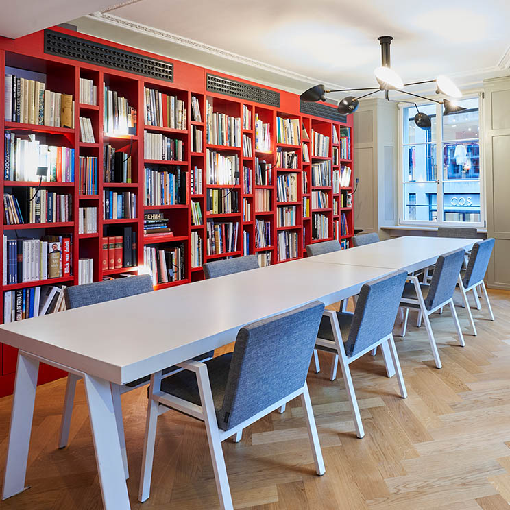 In der Bibliothek entstehen kreative Ideen ganz von selbst. Das besondere Flair des stilvoll renovierten Altbaus mit seinem dezenten, modernen Charme bietet den idealen Rahmen für kleine Besprechungen und Workshops.